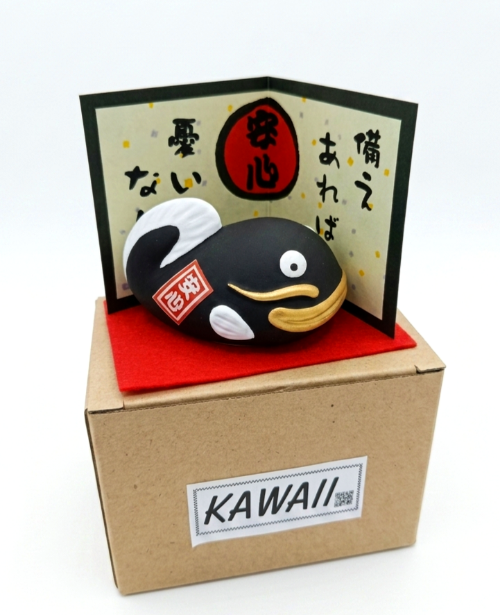 amuleto tradicional japonés conocido como Namazu (pez gato o siluro), presentado como una figura decorativa de la suerte. En la mitología japonesa, el Namazu es una criatura gigante que vive bajo la tierra y, según la leyenda, causa terremotos, pero también es venerado como un símbolo de protección y redistribución de la riqueza