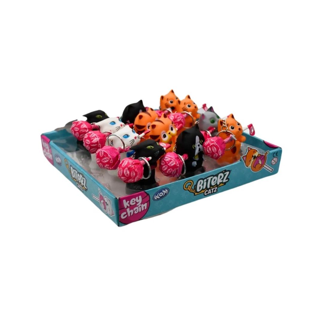 Chicle con llavero de gatito incluido. El chicle tiene sabor frutal, y el llavero se puede usar en bolso, mochila, chaqueta o llaves.